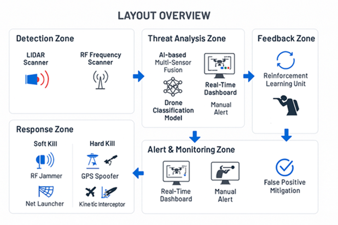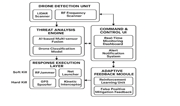 An adaptive anti-drone system to achieve the protection of critical sites. This model incorporates LiDAR, RF scanning, and computer vision to identify, track, and categorize aerial threats. An onboard AI fusion engine evaluates the threat level on the basis of the trajectory, speed, and proximity, and chooses the most suitable countermeasures, ranging between GPS spoofing and RF jamming, all the way to net launchers and kinetic interceptors. Engagements make the system learn constantly to minimize false positives, enhance the performance, and ensure reliable deployment in sensitive and high-risk settings.