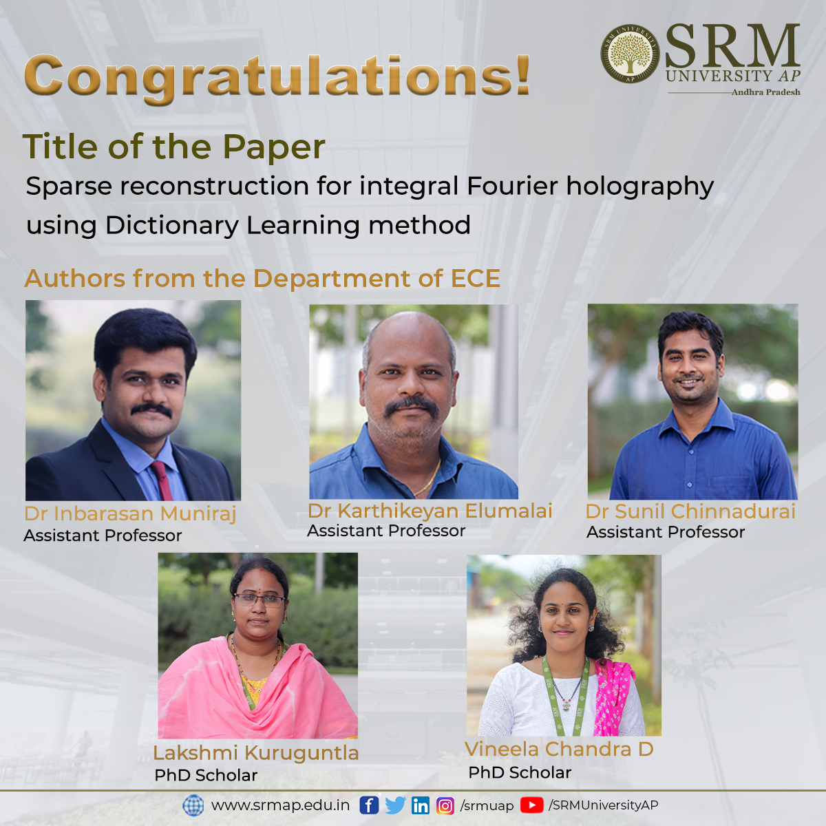 A paper titled “Sparse reconstruction for integral Fourier holography using Dictionary Learning method” has been published by Dr Inbarasan Muniraj, Dr Karthikeyan Elumalai and Dr Sunil Chinnadurai – Assistant Professors of Electronics and Communications Engineering at SRM University-AP, along with PhD students Lakshmi Kuruguntla and Vineela Chandra Dodda.